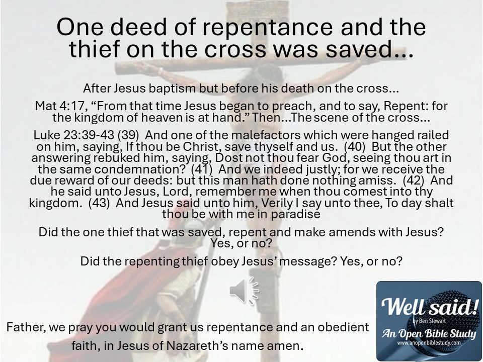 Repentance is a change of heart…feeling sorry for our poor behavior…change in mind…deciding to do better and make better decisions…and a change in direction…fulfilling the change heart and mind with changed deeds. It is a U-turn if you will away from selfish desires and actions to a God oriented direction. Have you ever made a commitment to God I did when I was baptized… And the Lord's servant must not strive, but be gentle towards all, apt to teach, forbearing, in meekness correcting them that oppose themselves; if peradventure (perhaps) God may give them repentance unto the knowledge of the truth, and they may recover themselves out of the snare of the devil, having been taken captive by him unto his will...2 Timothy 2:24-26. It says God may grant us repentance…we need God to change according to His truth.